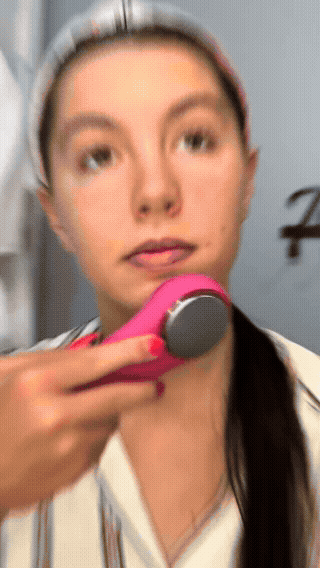 Befeuchte dein Gesicht und trage dein Lieblingsreinigungsprodukt auf. Schalte die Bürste ein – sie beginnt sofort mit sanften, pulsierenden Bewegungen. - Reinigen & Verwöhnen